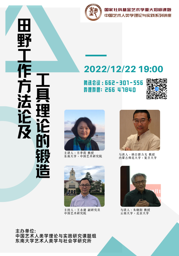 2022年12月22日晚19:00,國家社科基金藝術(shù)學(xué)重大招標課題“中國藝術(shù)人類學(xué)的理論與實踐研究”系列講座第八場順利舉辦。面對藝術(shù)人類學(xué)國外先進理論和經(jīng)驗引進國內(nèi)后,如何內(nèi)化為符合我國本土田野藝術(shù)和田野實踐需要的工具、理論和方法,本期講座特邀請東南大學(xué)首席教授、中國藝術(shù)研究院藝術(shù)學(xué)研究所名譽所長方李莉教授,進行了題為《田野工作方法論及工具理論的鍛造》的講座。為達到更好的效果,同時邀請納日碧力戈教授和朱曉陽教授為本次講座的與談嘉賓。本次講座由國家社科基金藝術(shù)類重大項目“中國藝術(shù)人類學(xué)的理論與實踐研究”課題組主辦,通過騰訊會議和嗶哩嗶哩直播平臺同步直播,累計觀看人次800有余,線上互動氣氛熱烈,交流效果斐然。