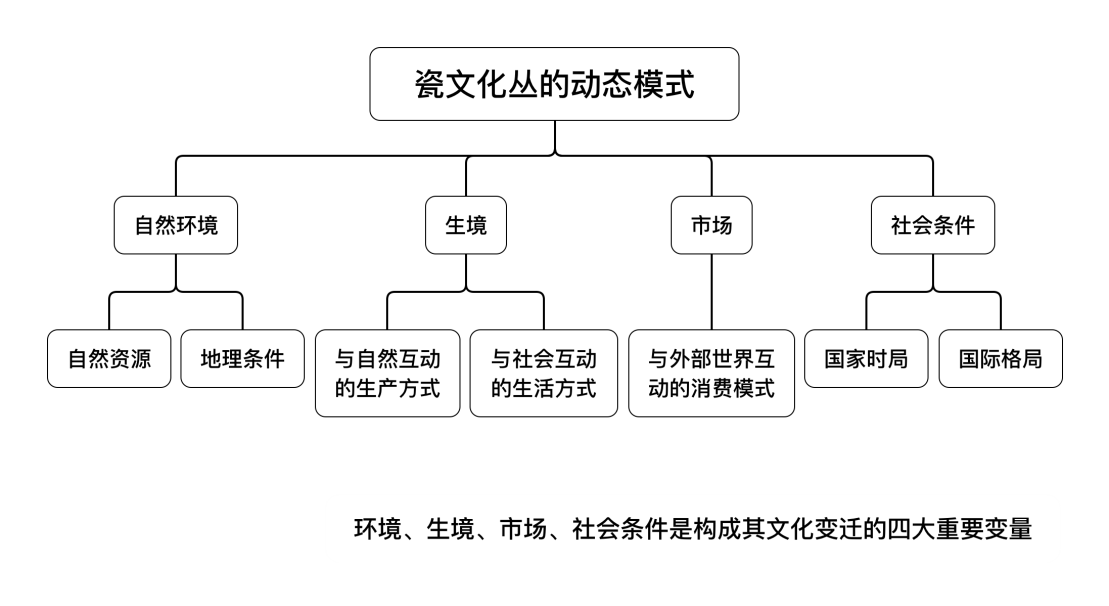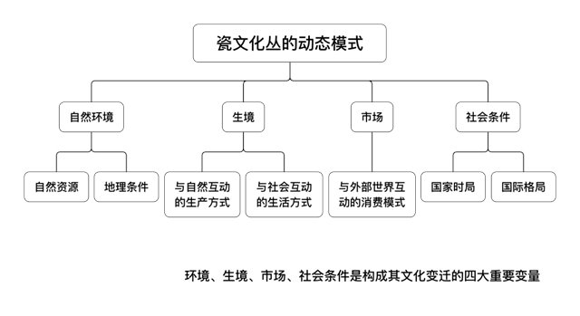 (4)瓷文化叢。這是方李莉教授在自己的田野研究中所鍛造的一個理論工具,其在研究中,把景德鎮(zhèn)的陶瓷業(yè)作為一種“文化形式”來研究。按照人類學(xué)的解釋,一個部落文化包括許多的單位,這就是文化特質(zhì)。研究者入手時必須要以一個特質(zhì)為工具,這些特質(zhì)并不是簡單的一件事物,它必須有許多附帶的東西合成一個“文化叢”。這里將陶工們的造物方式劃分為一個“瓷文化叢”,其載體不是一個部落,而是一個行業(yè),通過制瓷行業(yè)生產(chǎn)而附帶出各種事件的結(jié)合體。“瓷文化叢”深入到依賴其所生存的人們的生活中的方方面面,不僅包括它的生產(chǎn)方式、宗教崇拜、行業(yè)規(guī)則、禁忌和習(xí)俗等,甚至還包括了衣、食、住、行等生活的細節(jié)方面。這里除了有空間的尺度之外,還包含了時間的尺度。因此“瓷文化叢”概念是動態(tài)的,不是扁平靜態(tài)的快照,而是有動態(tài)情境的影片。“瓷文化叢”作為一個動態(tài)的模式,其形成過程中存在4個變量:一是自然環(huán)境的變量,二是與自然、社會互動的生產(chǎn)方式,三是市場與外部世界互動的消費模式。四是社會條件,也就是國家時局、國際格局。這四個方面是社會發(fā)生變化的重要的變量,這些變量形成了“瓷文化叢”的動態(tài)發(fā)展過程。