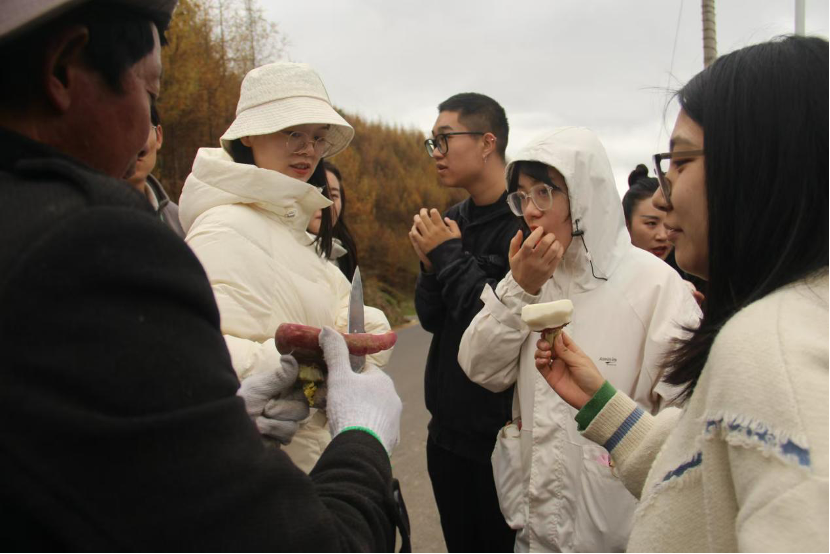 在這里,工作坊師生們還看到了傳統(tǒng)與現(xiàn)代結(jié)合的彝族特色建筑,每家每戶墻壁上都涂著“羊角紋”,通過(guò)向當(dāng)?shù)厝藛?wèn)詢,了解到這寓意著吉祥如意。山間的道路蜿蜒向遠(yuǎn)方,路邊有一片連著一片的綠油油的菜地、一堆堆金燦燦的玉米。沿路上許多忙碌于豐收的村民們,臉上都掛著喜悅的笑容與工作坊師生們打招呼,他們熱情的讓我們自己扯地里面的圓跟蘿卜吃,許多同行的成員第一次吃到原汁原味的圓根蘿卜,紛紛贊嘆它的美味,村民們也露出了幸福的笑容,熱情的邀請(qǐng)大家去家中做客。