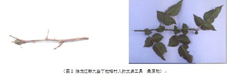 關于獨龍族文身的工具,有學者介紹是用竹簽[⑧]文刺。筆者所在的中日傳統(tǒng)文化比較研究小組中的日方學者桑原稔先生于2006年11月在貢山獨龍族怒族自治縣獨龍江獻九當丁拉梅村民俗時采集了標本(圖2)。據當地人介紹,獨龍族人多用這種帶刺的植物作為文身的工具。文身工具分為兩個部分:文刺棒和敲擊棒。文刺棒長約12~15厘米,文刺棒直徑0.3~0.5不等,敲擊棒直徑1厘米左右。文刺時,把文刺棒對準文刺的部位,用敲擊棒輕輕敲擊以使刺針入肌膚,見血后點入顏料。