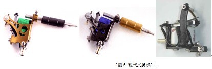 通過對文身工具演變歷史的回顧,我們認識到,文身工具的演變大致經歷了植物、動物刺(碎石片、水晶片、動物骨刺等)→鐵針、銅針、銀針等→鋼針等→手動文身機→電動文身機……這樣一個從植物、動物到金屬的進化性過程,也就是從天然物到人工制造物的進化過程,這恰好與人類制造和使用其他工具的歷程是一樣的。在經過千百年的歲月之后,今天的文身工具無論材料還是使用的便利程度上都發(fā)生了質的變異。