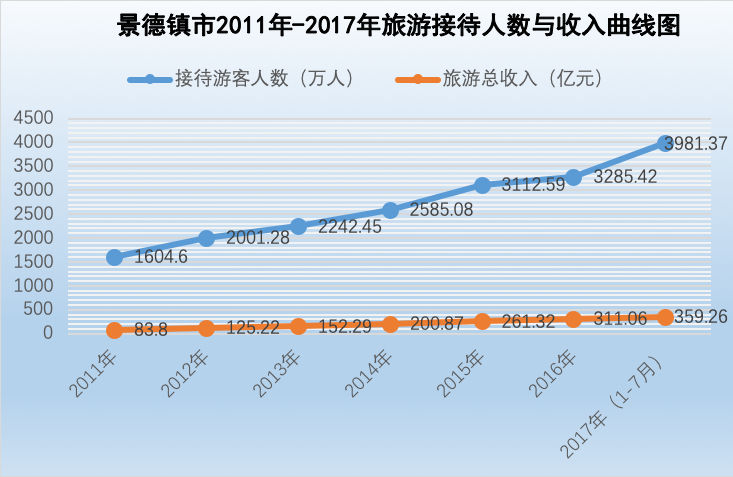從旅游接待人數(shù)報(bào)表(圖一)來看,景德鎮(zhèn)市旅游接待人數(shù)和旅游收入持續(xù)增長,從2011年的1604.6萬人到2017年上半年的3981.37萬人,旅游收入從83.8億元增長到359.26億元,實(shí)現(xiàn)了跨越式的發(fā)展,說明景德鎮(zhèn)這座歷史古城吸引著越來越多的游客來此觀光,旅游業(yè)對財(cái)政收入的貢獻(xiàn)率也在逐步提升。機(jī)器大工業(yè)的生產(chǎn)方式退出,傳統(tǒng)手工藝復(fù)興,知識(shí)和信息居于社會(huì)的中心地位,服務(wù)性的旅游經(jīng)濟(jì)興起,綜合這些特征來看,可以說景德鎮(zhèn)已經(jīng)具備了后工業(yè)社會(huì)的一些典型特征。